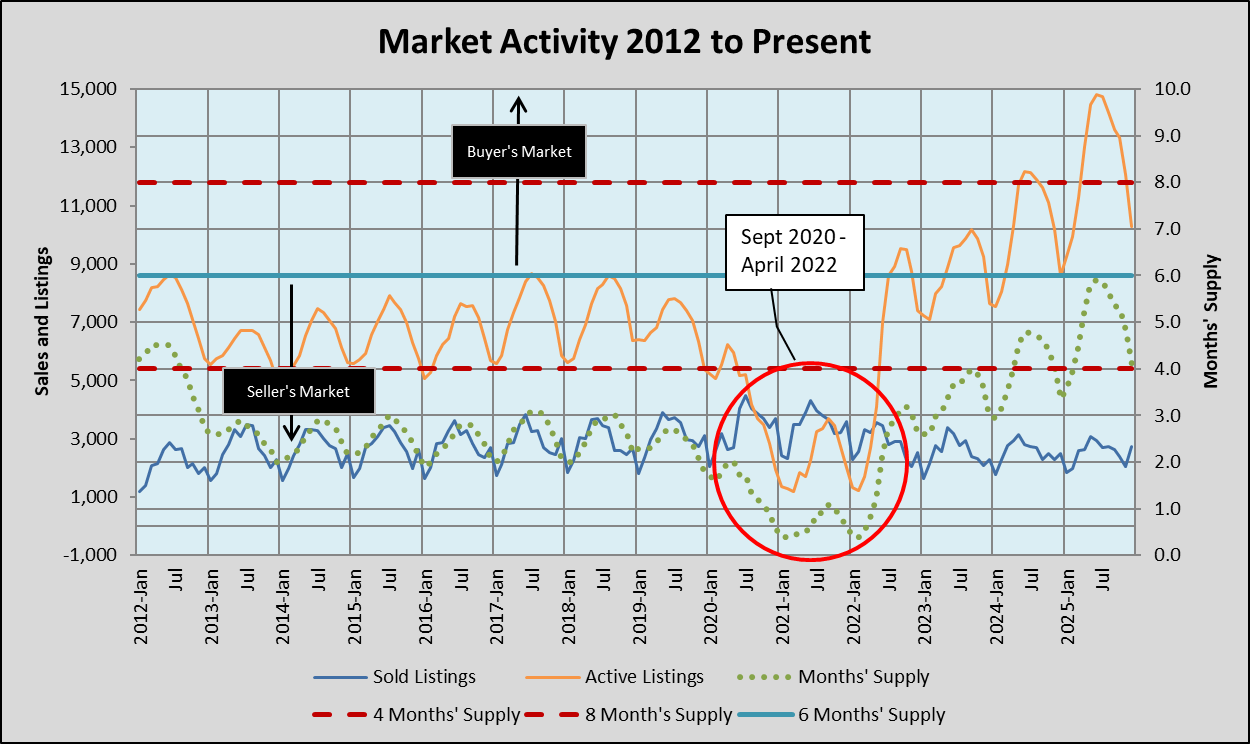 This chart shows the extreme changes in our supply-and-demand picture in 2025, with the number of active listings soaring from 8,600 in December 2024 to 14,824 in June 2025 and then sinking to 10,291 in December 2025. That was a72% increase in the first half of the year followed by a 31% inventory decrease in the second half. While that happened the number of homes sold averaged about 2,500 across the year with no remarkable changes. The months’ supply metric reached 5.9 months in June and July and ended the year at 4.1 months’ supply.: