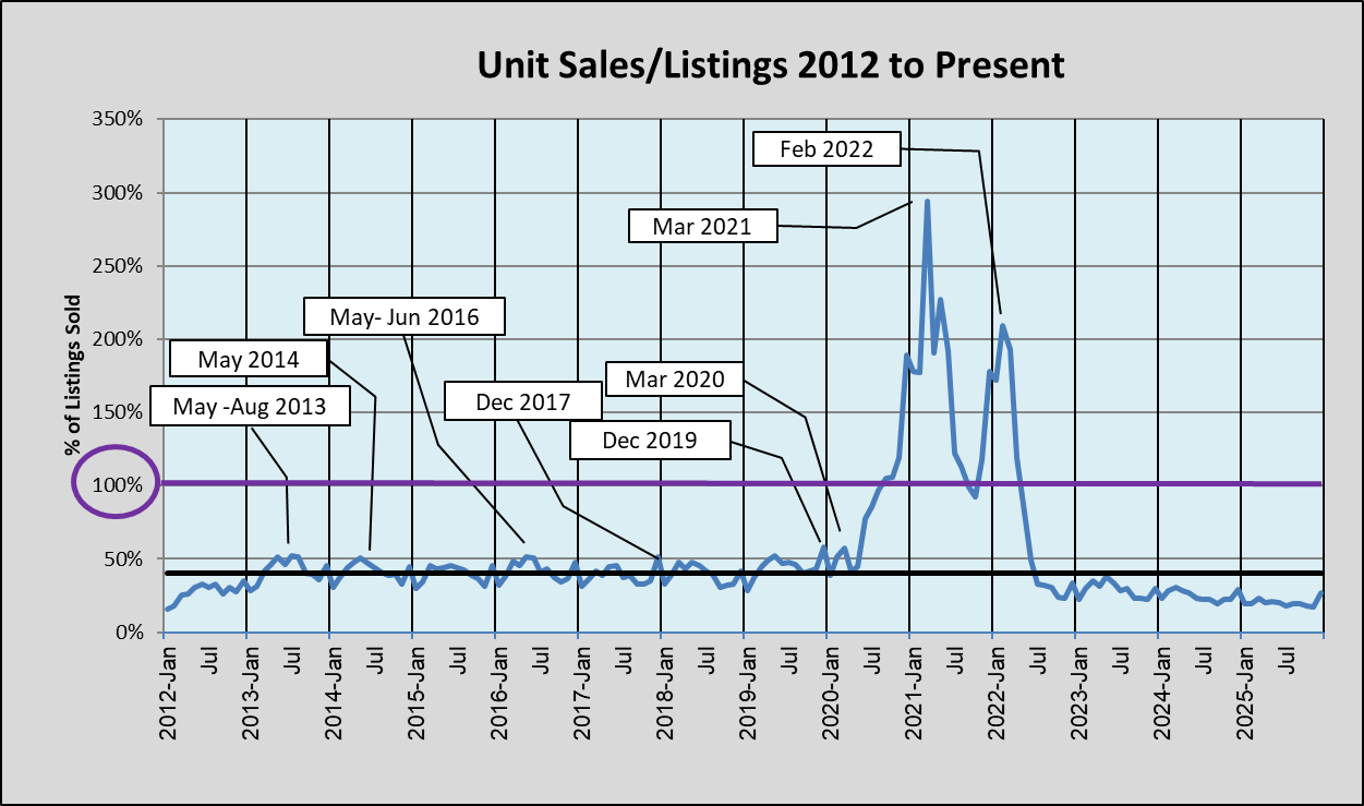 The ratio of home sales to available listings was the lowest in 2025 that we have seen in this entire cycle: