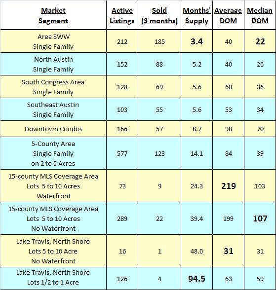 The data in the table above is a very small sample, and just one way to slice the Austin-area market. There are probably even more extreme examples of fast-moving and horribly over-supplied market segments, but I have included some where I have been working lately. The important point is: When you read about the health of a local or regional real estate market, do not assume that all properties compete in the same market conditions. This kind of market knowledge and market analysis is an important reason — whether you’re buying or selling — to have an experienced real estate professional representing your interests in any property transaction.