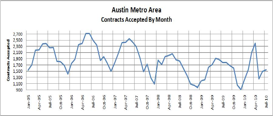 The article points out that “The Pending Home Sales Index, a forward-looking indicator, declined 2.6% to 75.7 based on contracts signed in June 2010 from an upwardly revised level of 77.7 in May, and is 18.6% below June 2009 when it was 93.0.” I won’t try to recreate the PHSI calculations here, but I have compiled the number of new residential sales contracts signed in the Austin Metro Area in each month since 2005. More on that shortly, but for now consider this comparison: there were 18.6% more contracts signed in Austin in June 2010 than in May 2010, but June 2010 was down 20.1% from June 2009. New contract volume in Austin increased again in July, but was still down 13.2% compared to last year. RISMedia does not yet report on July data, but I pulled this information from the Austin/Central Texas MLS so it is as current as I can retrieve at this point.