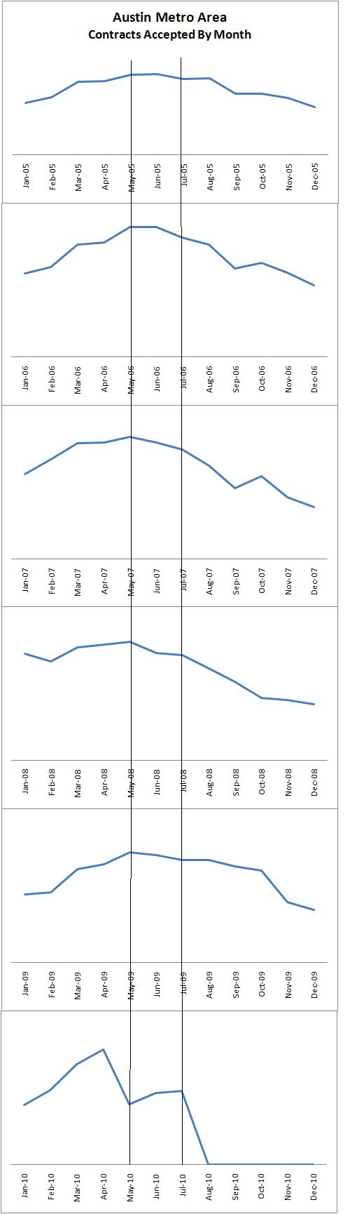I have added vertical lines through May and July to make it easier to see a couple of unique features of Austin’s 2010 pattern. Again, the number of new contracts signed plummeted from April to May 2010. The year’s peak month moved forward in response to tax incentives. In every year from 2005 through 2009, new contract volume declined in June and July. Not so this year. I am tempted to call that encouraging, but two months do not establish a trend. Obviously, we have no August data to analyze yet for this year, so this will require follow up, but it appears that “left over” demand after the last tax credit program may still make itself known.