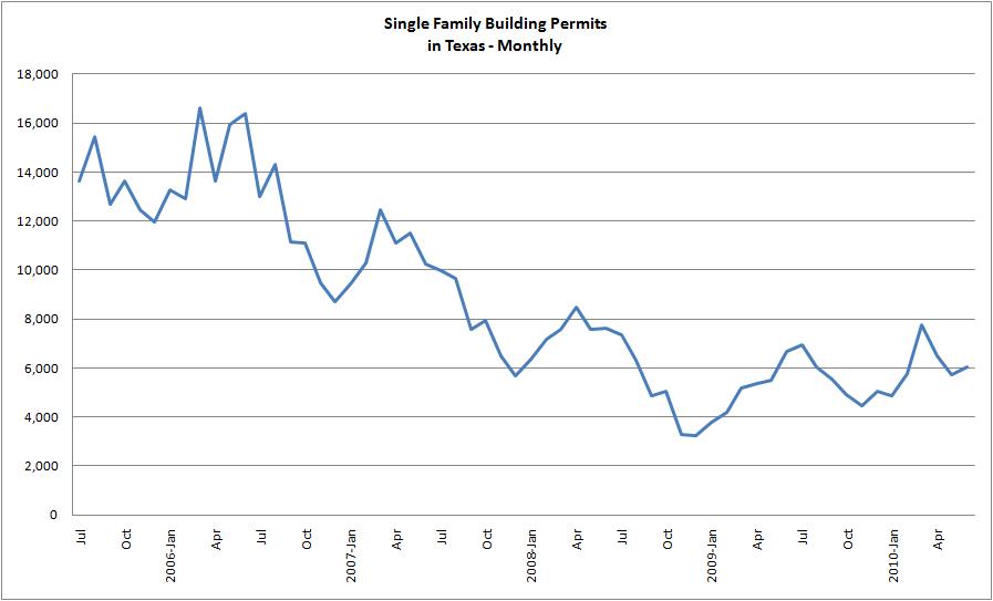 The newest “final” data that I have found on new single-family residential building permits in Texas runs through June 2010: