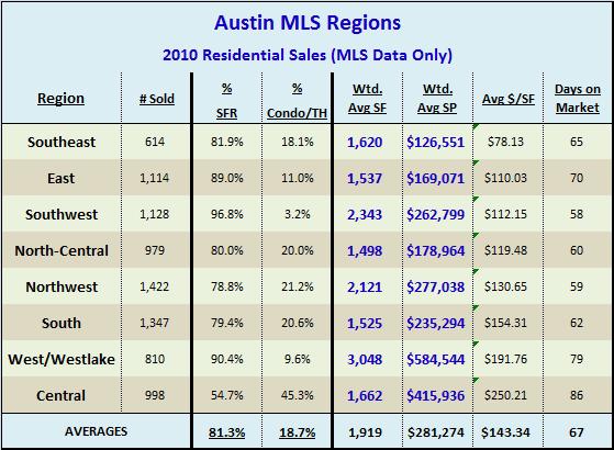 The average size of single family homes sold in 2010 ranged from 1,570 to 3,171 square feet and average sale prices ran from a low of $132,741 to a maximum of $536,710. I am frequently asked about the “price per square foot” in Austin, and I suppose based on this data it would be accurate to give the simple answer of $143.00. How useful is that answer, though, when houses sold last year were valued from $75.77 to $253.40 per square foot?