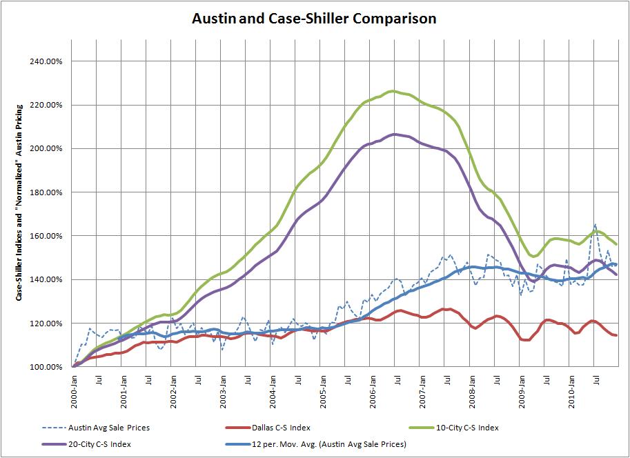 I have elaborated before about the S&P/Case-Shiller Home Price Index and how representative it is (or not) of conditions in the Austin/Central Texas real estate market. (Most recent comments: Case-Shiller caution — national index, local business, 12/03/10; Quick comparison — Austin vs. Case-Shiller Index, 01/26/11; and Housing Bubble? Austin compared to Case-Shiller cities, 01/30/11)