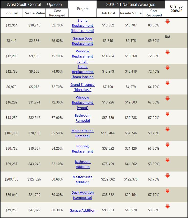Remodeling Magazine follows this information closely and publishes annual results of surveys on the subject. Here is their look at cost vs. value for specific improvements to mid-range homes, ranked by “Cost Recouped” and focused on the Austin/Central Texas area: