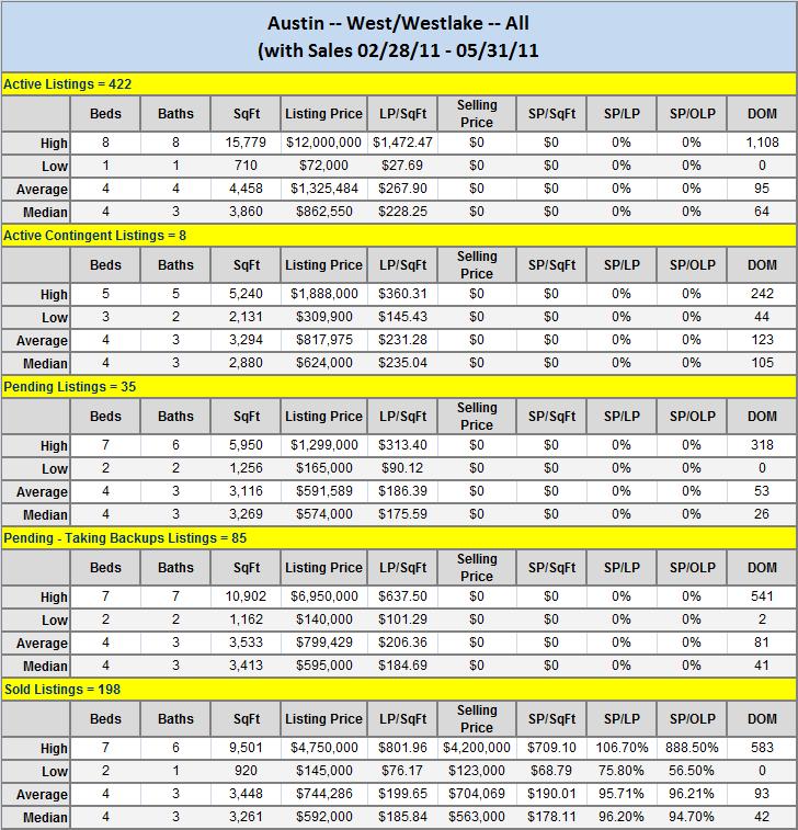 In a couple of recent posts I discussed the market environment in various price ranges around the Austin/Central Texas area, and pointed out that some market segments here are clearly moving well regardless of the “typical” price range in the area, while others are moving VERY slowly. (See Austin sales performance by price range, 05/07/11 and Austin/Central Texas market performance — what’s selling?, 05/10/11.) There is no direct correlation across the area between “market velocity” and price range.