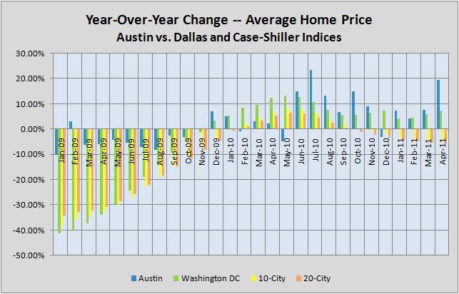 Since Austin is not included among the Case-Shiller cities I have used the 12-month moving average of sale prices as a proxy. Notice that that point in April 2011 was higher than all points to the left on that line. Our average prices dipped a little in 2009 and 2010, but they have recovered and are on the rise again. I expect the 12-month average to dip again in July 2011 because the period being averaged will no longer include the all-time highest point in July 2010, but the trend remains clear.