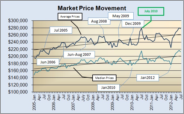 Continuing market confusion — relative market strength locally confounded by very negative national reports and distorted by repeated unseasonal demand spikes (due to homebuyer tax credits) — led to price softness for more than a year after that, with average and median prices reaching bottoms in January 2012. Seven months later, sales prices this Summer have rebounded to peak levels.