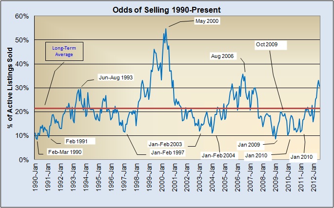 For those who have followed this site, you know that I began tracking this data five years or so ago, when buyers started coming to me with a desire to buy “at the bottom” of the market cycle. It remains true that the only sure way to recognize a market bottom is in the past. Nonetheless, I gathered and organized a lot of data and found a fairly reliable correlation between market growth and market absorption — i.e., since 1990-91 growth cycles followed months in which a low point of about 10% of active listings sold: