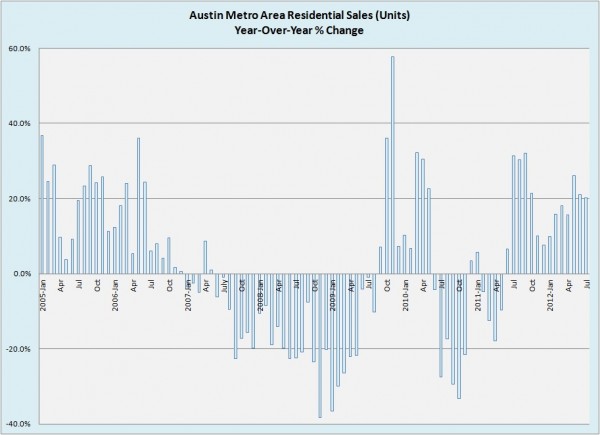 By June 2011, month-to-month sales looked much more normal, and 2012 has obviously been stronger. July 2012 marked 14 consecutive months of year-over-year sales increases in the Austin metropolitan area.
