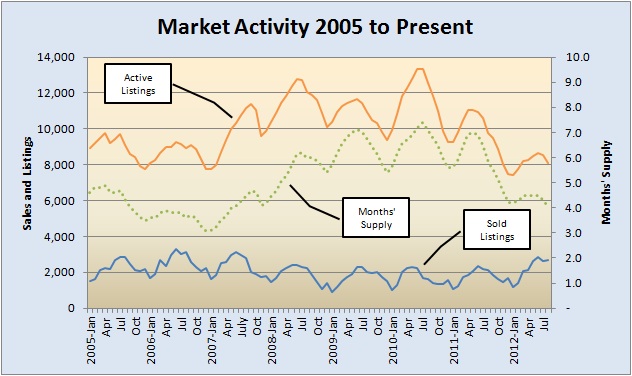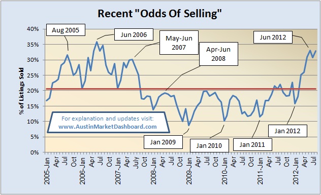 There are plenty of potential negative influences in the coming months from outside Central Texas, but this view of my Austin Market Dashboard, through August 2012, is cause for optimism. (See complete, printable Market Dashboard charts on my Austin Market Dashboard page.)