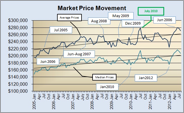 Sales prices have remained remarkably stable in the Austin area — certainly when compared to the few states that took the worst of the housing downturn. Average and median prices before the downturn peaked in May and August 2008, wallowed 9% to 10% lower into the summer of 2010, then reached an all-time high in July 2010. That upturn proved transitory and prices moved lower again until 2012: