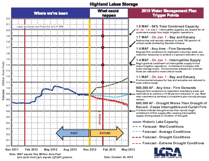 Interestingly, by the end of September 2012 we recorded more rain this year than the 30-year annual average from 1981 through 2010. Most of it completely missed the Highland Lakes, however. The rainfall may help to reduce usage somewhat where it fell, but it did very little to replenish badly needed supply. Here is LCRA’s projection of possible future scenarios: