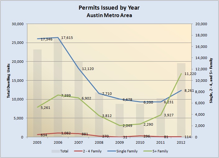 The big story in that chart, however, is approved plans to build apartments and condominiums — almost 3X from 2011 to 2012! Single family construction will be constrained for a while yet by limited availability of land, but the 5+ Family permitting activity is a huge sign of confidence in continued growth and demand in the Austin metropolitan area.