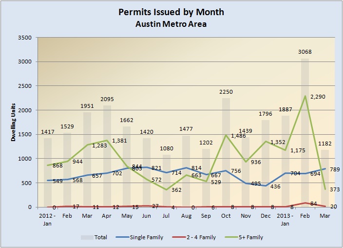 I have not seen final April data for the Austin area yet, but I took this article as a prompt to write an update on new housing construction activity here. I will provide another update when April data is available.