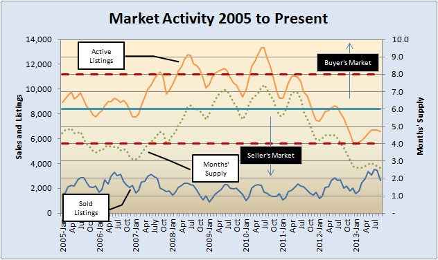 Market absorption peaked during Summer 2013 with 3 of 4 months in which more than half of all active listings sold: