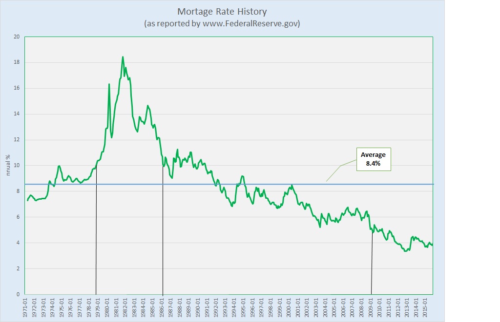 We are now approaching seven years with mortgage rates below 5%. For many that has come to feel “normal,” but for much more time during the past forty years, rates were actually two or three times as high, and higher. In fact the average mortgage interest rate since 1971 was 8.4%.