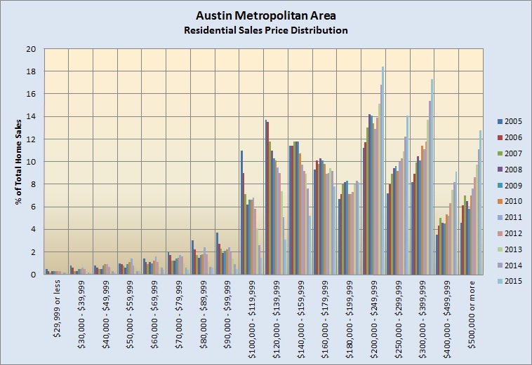 The top half of the table shows the percentage of sales each year in the price ranges used on the graph. I have highlighted the ranges in each year that represented 10% or more of the year’s sales. Notice that since 2011 all of those highlights are above $200,000.