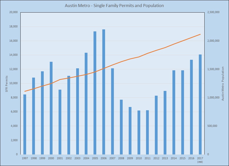 The Austin metro population data shown by the orange line is confirmed through 2016. I extrapolated 2017 growth at the same pace as the previous two years. There are two important points to make about that chart: