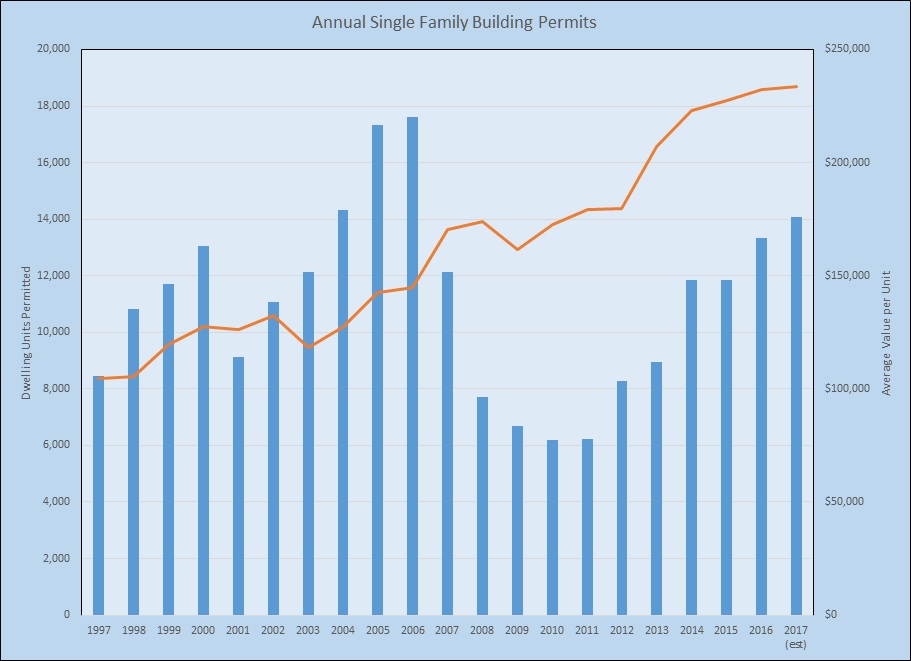 The impact of the 2007-2008 mortgage crisis and the resulting national housing industry issues are apparent, as is the return of growth to the Austin-area in 2012. Note, however, that even as builders dramatically reduced their activity in 2007 – 2011, the value per unit did not decline very much or for long. Also note that since 2012 the per-unit value of a permit accelerated, albeit with some moderation over the past couple of years. The average value of a single family building permit in 2017 was about 34% higher than the 2008 pre-meltdown peak, and about 45% above the 2009 valley.