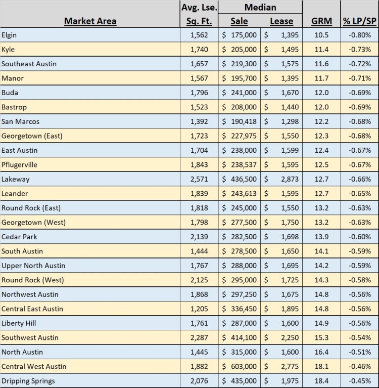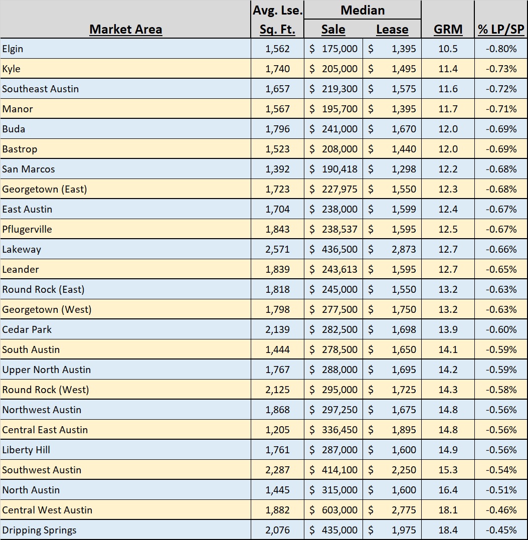 Real estate investors may use any of several calculations in considering how much they might pay for a rental property. The Gross Rent Multiplier is one of the simplest, and it’s easy to compare without making detailed assumptions about operating costs. Using that measure, here is a ranking of some of the major market areas in the Austin metro: