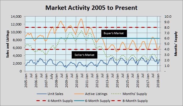 Now, with final data in for the entire first quarter of 2018, I can report that we have NOT returned to “normal” this year. Here’s a look at the percentage of active listings that sold each month from 2005 through 1Q ’18: