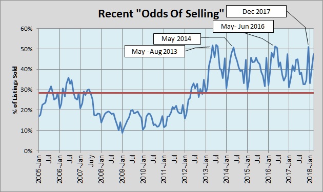 The fact that the traditionally slow month of December was the fastest-paced month in all of 2017 was a clue that we had not seen a slow-down. For comparison, the average “odds of selling” for all of 2016 was 42%. The same calculation for the first 11 months of 2017 was 38%. But then it went to 51% in December!