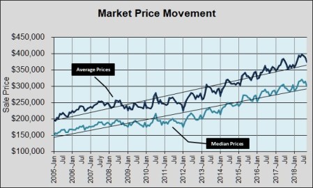 Most market analysts consider 6 to 6 1/2 months’ supply to represent “normal” or “balanced” market conditions. Notice how long our local market inventory has been at or below half of that level. Listing inventory in September was 3.0 months, unchanged from August and the same as September 2017. Seasonal performance looks very much like each year since 2014.