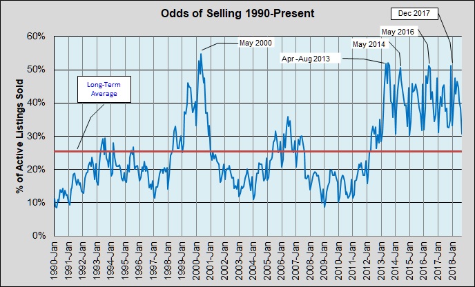 My earlier post also discussed market absorption — i.e., the “odds of selling” for an active listing each month. For historical perspective, this chart clearly shows how different this market cycle has been from all others in almost 30 years: