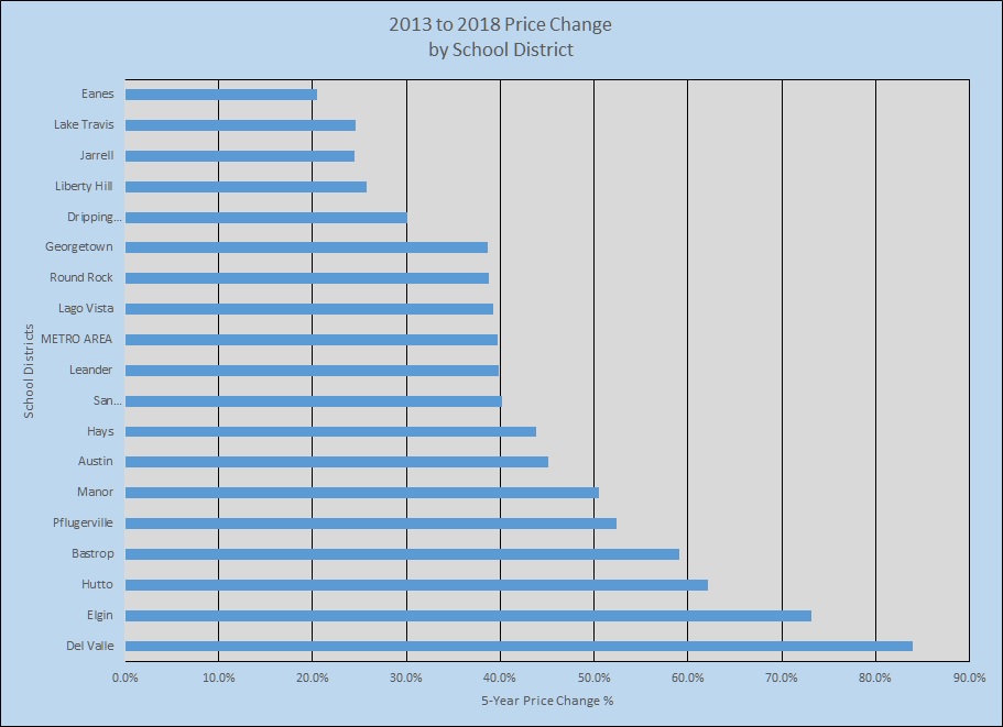 There’s not a perfect correlation, but the lowest-priced school districts are generally experiencing the most dramatic increase in home prices, from just under 40% in Round Rock, Lago Vista, and Leander to almost 85% in Del Valle ISD!