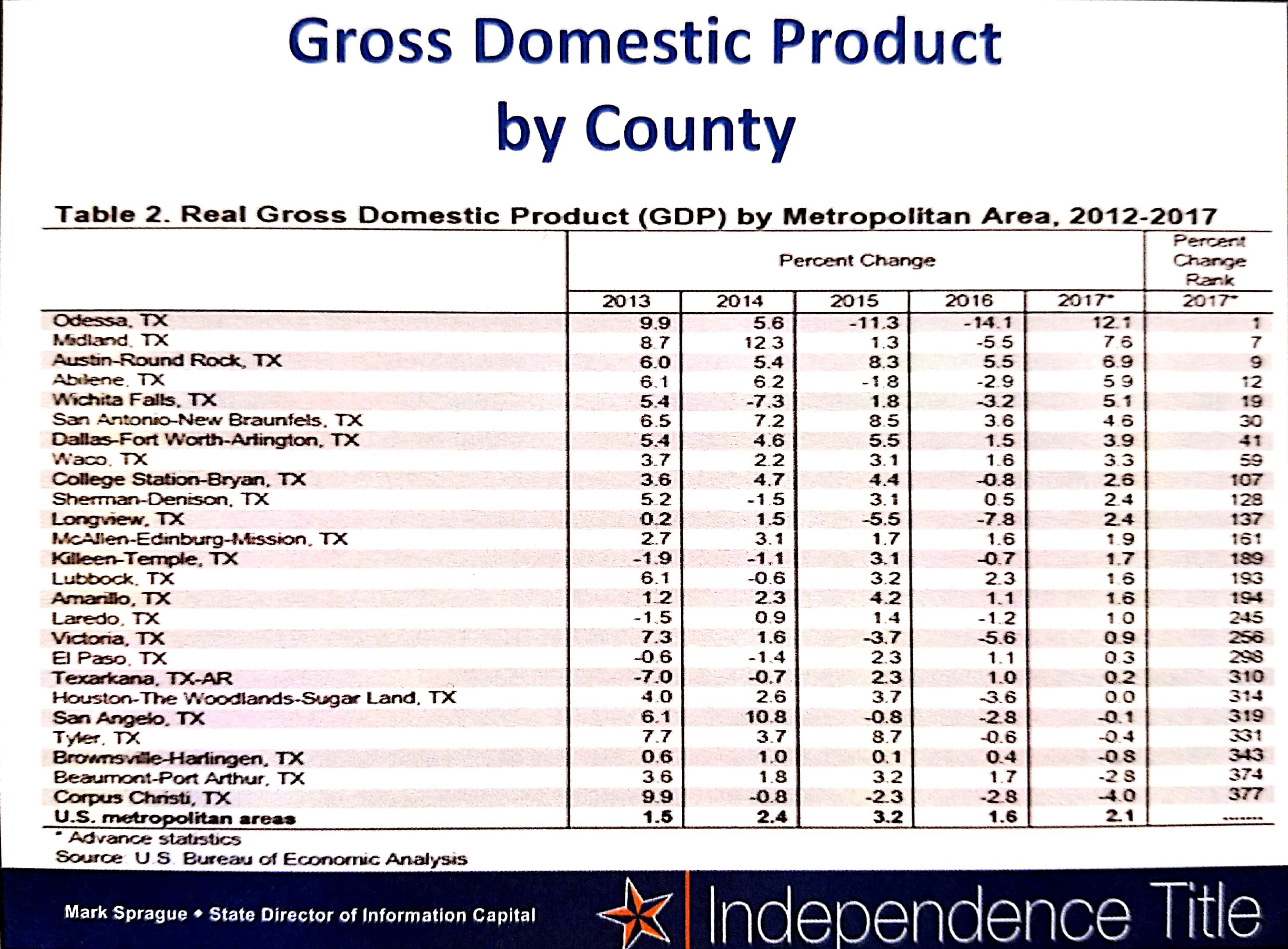Notice at least through 2017 the Austin-Round Rock metropolitan statistical area was behind the Permian Basin and its enormous growth in oil and gas production, but well ahead of all other Texas MSAs and more than three times the average growth rate of all charted U.S. MSAs.
