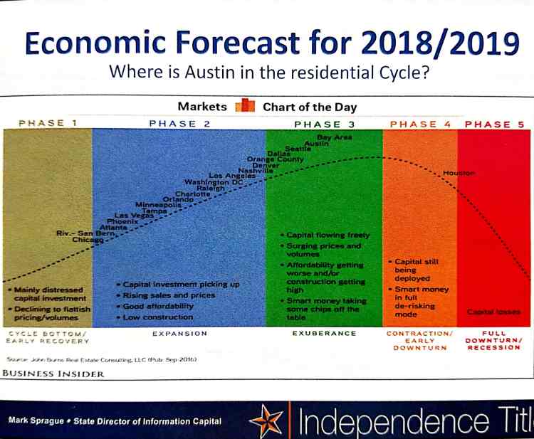 Last week I attended a great presentation by Mark Sprague, Director of Information Capital for Independence Title. His view of the state of our real estate market is much like mine — that the market cycle is maturing but by no means turning down in Austin and Central Texas. This chart is a good summary: