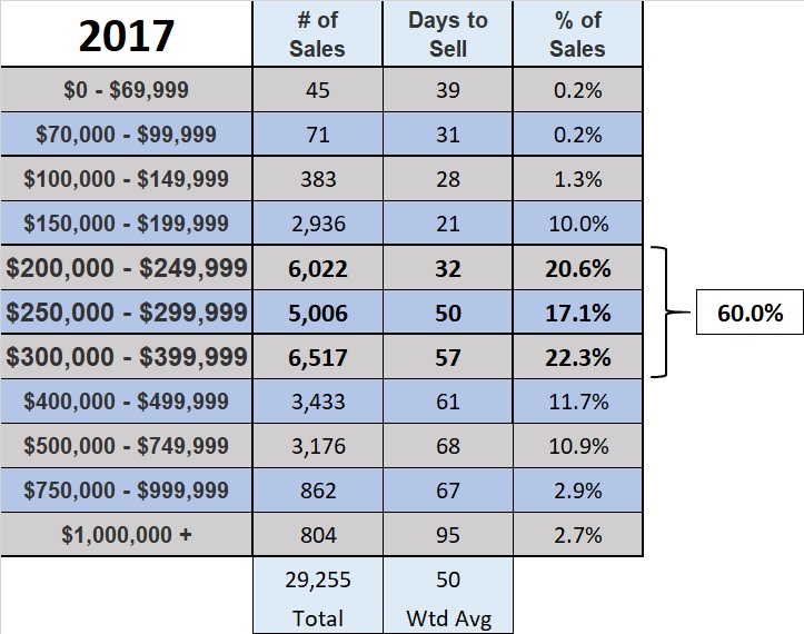 - Over the same five years, the percentage of sales under $200,000 fell from 34% to 7%. That’s a loss of almost 7,000 dwelling units in this important price range!