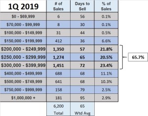 The percentage of total unit sales in the $200,000 to $400,000 range grew from 46% in 2014 to 62% in 2018, and to 66% in the 1st quarter of 2019 because the availability of homes under $300,000 fell dramatically: