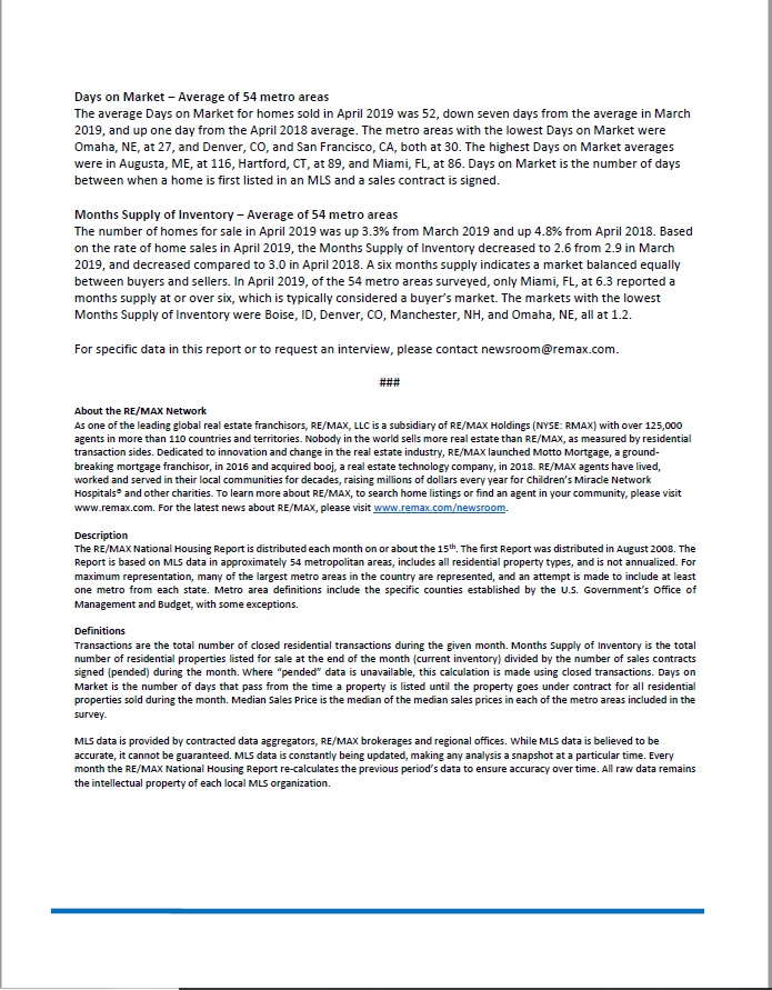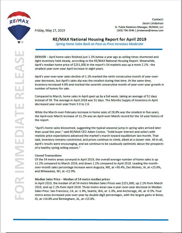 RE/MAX publishes it’s housing report on or about the 15th of each month. They’re available at CentralTexasHomeSearch.com. Just go to Market News and then to RE/MAX Housing Report. The May 2019 report will be available soon, but here is the most current issue for now: