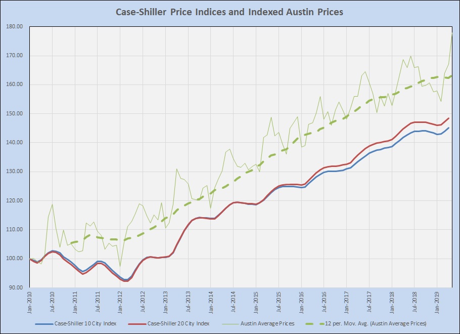 Using monthly average Austin home sale prices I indexed changes to a “base” of January 2010. (I.e., January 2010 = 100.) For this comparison I also indexed Case-Shiller data to January 2010. Then I graphed that data: