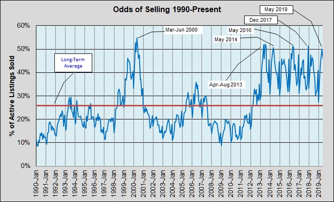 Now compare the last two charts and you’ll see — as you should expect — that in soft market conditions (i.e., lower Odds of Selling) home prices were below the long-term trend line (with a slight lag). In times of stronger market conditions home prices rise above the trend line. That’s where we are now.