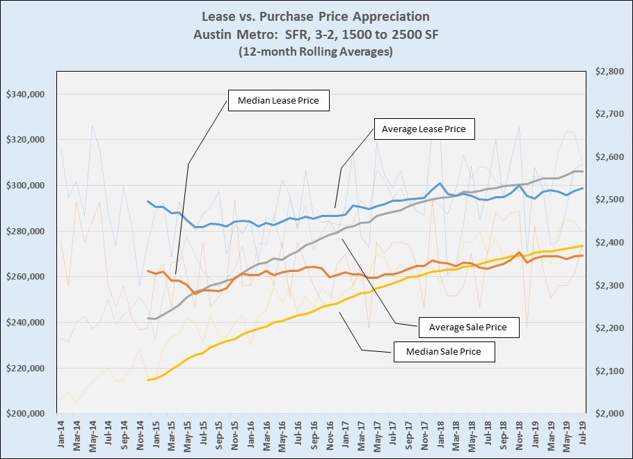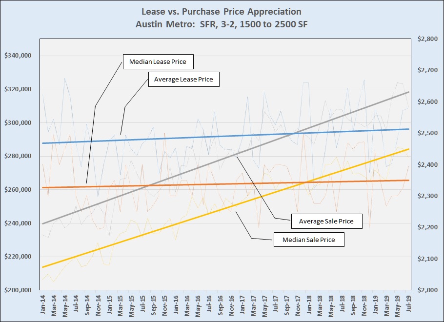 I have written frequently about the rise of sale prices in the area, and I have noted that annual price appreciation continues but has slowed compared to 2013, 2014, and 2015 (First-half 2019 Market Performance). With that in mind, let’s compare the pace of change over the past 5-plus years in sale prices and rents for single family homes. To make this information reasonably relevant, I chose to work with a fairly narrow market segment: houses with 3 bedrooms and 2 baths, 1500 to 2500 square feet in size, across the 5-county metro area. Here are the results: