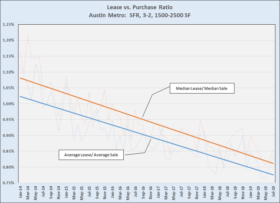 I used straight-line trends in the first chart to emphasize the difference, but using the moving averages shows the same situation: Average and median sale prices have risen quickly in recent years, while median rents for houses have remained almost flat and average rents have increased only a little.
