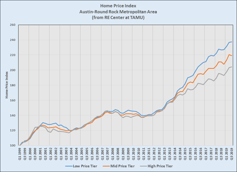 Focusing on the Austin metro area, the HPI data allows us to see a little more — price changes in different tiers of the market. Here’s a longer view of just our area: