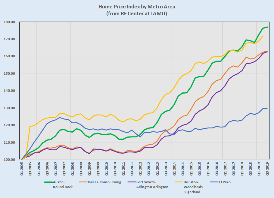 If you visit the Real Estate Center’s website you’ll see that they have more data for some areas than others, but I have re-indexed all of these to 2005 so we can compare them easily. The general slopes of four of those five lines are about the same. The exception is El Paso, which in 2019 is just a little higher than it was in 2007. Dallas and Fort Worth diverged a little during the early years of the recent boom and have essentially reconverged this year. Houston led Austin (and the rest of the state) in price appreciation until about two years ago, when Austin moved ahead. (Note that the RE Center didn’t have 3Q 2019 for Houston when I built this chart.)
