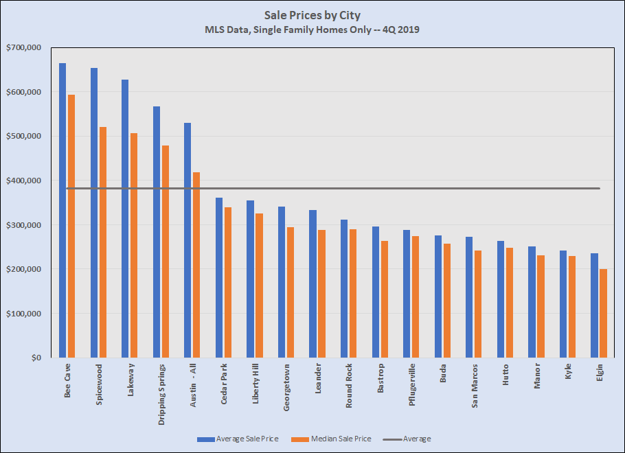 Average and median prices in Austin, Dripping Springs, Lakeway, Spicewood, and Bee Cave were all above $400,000, and above the $382,000 combined average price for the cities shown.