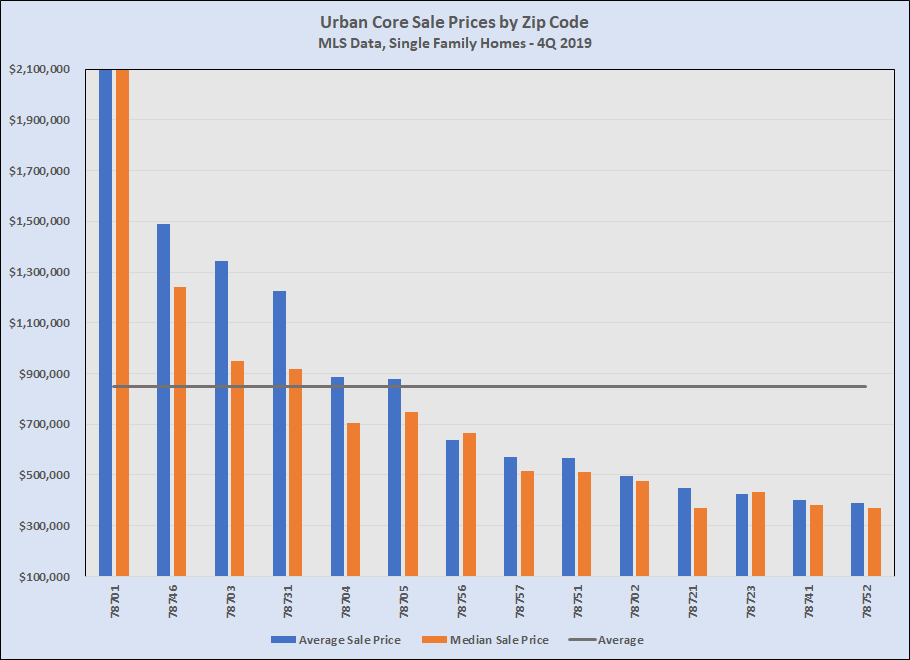 In the urban core (bounded by US 183, Ben White Blvd, and Loop 360 the average price in just one zip code (78752) and the medians in two (78741 and 78752) were in that under-$400,000 range, but notice that the combined average of these zip codes was about $850,000: