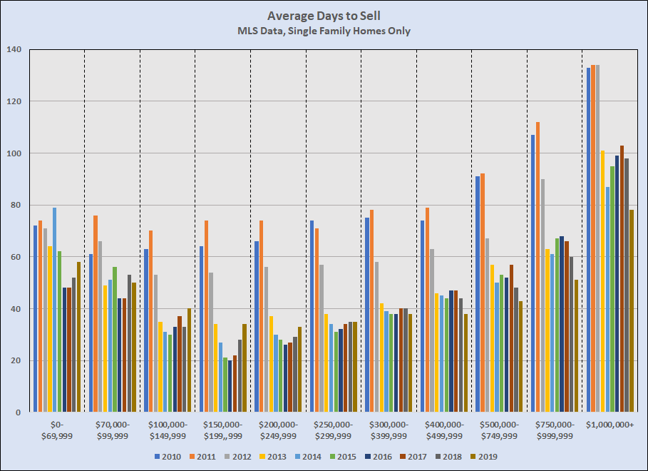 Finally, I have also commented (most recently in Market Pace and Pricing, August 2019) that the time to sell a home, on average, has been getting longer — not alarmingly, but measurably. That metric also varies by price range: