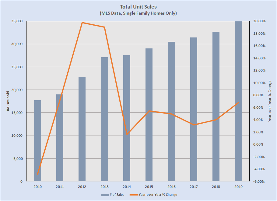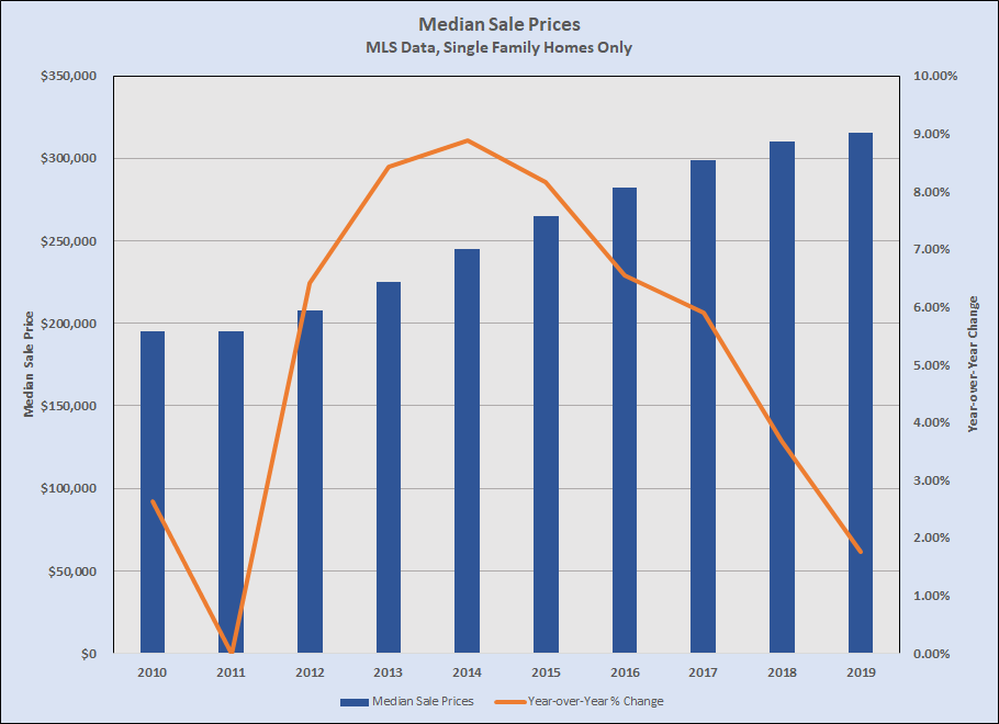 The number of home sales in 2010 was the lowest point of the recession for our area — 5% fewer than in 2009. Note also that the number of homes sold in 2019 was twice the number in 2010! 2012 was our year of recovery and the earliest stage of our market boom continued through 2013, then stabilized at about 1/3 of the pace of those first years.
