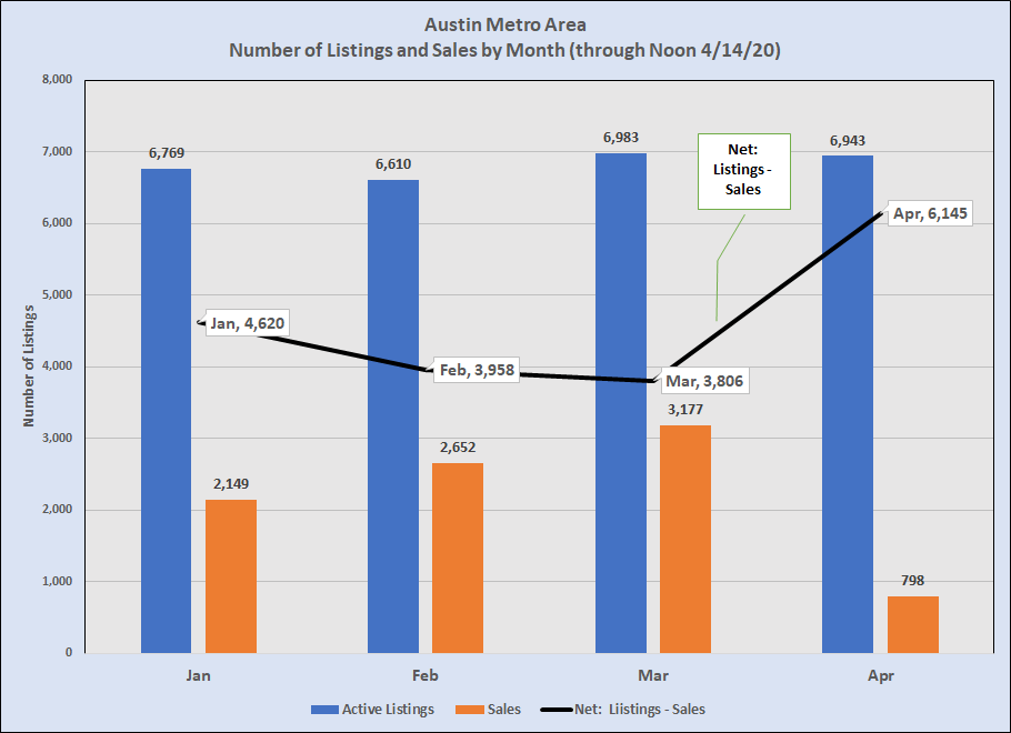 Listing inventory in March was just under 7,000 units, and March sales were almost 20% higher than in February! As I write this at noon on April 14, there were only 798 closed sales this month, and the net of listings minus sales is up 2,339 compared to March.