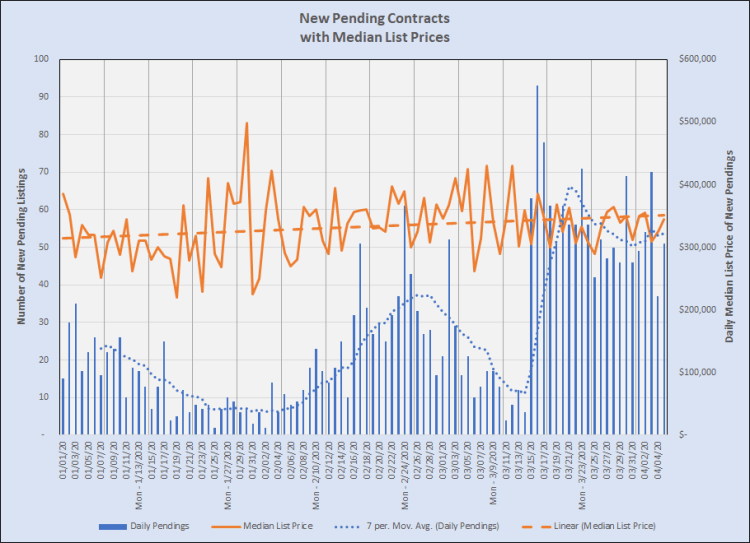 That chart shows the same daily sales as the other charts above, but it also includes the number of new listings that came on the market each day. The yellow line shows the “net new inventory” that resulted by April 5 — 2,331 active listings. That is about 3/4 of an average month of sales in 2019.