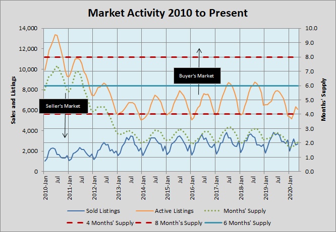 Look at the number of listings (orange line) on the market in the middle of 2010 — more than 13,000! Now look at 2020, with less than half of that inventory. The green dotted line in that chart shows an even more important fact: In 2010 that listing inventory represented more than 7 months’ supply at the pace of sales at the time. In 2020, the inventory of about 6,000 listings represents just 2 months’ supply!