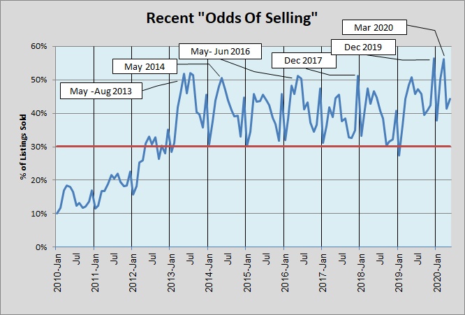 During 2010 an average of 14% of listings sold each month. So far in 2020, that average is 46%, more than triple the 2010 pace! And notice that that percentage was up in May 2020.