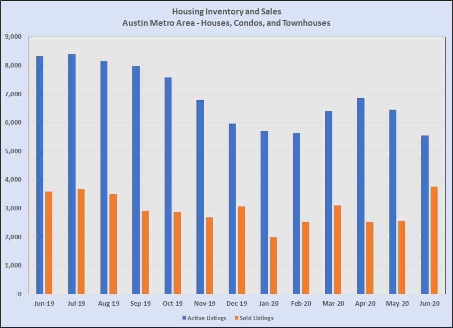 As noted in the Statesman article, sales in June 2020 were higher than the same month last year. They were also higher than every month since then. The number of homes for sale was depleted at the same time, with listing inventory dropping even below the seasonal lowpoint in January and February.